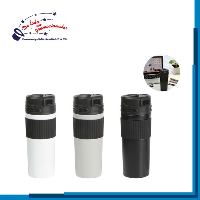 Termo fabricado en acero inoxidable. Incluye tapa de cierre de rosca fabricada en polipropileno con correa adecuada para cargar y boquilla para tomar.