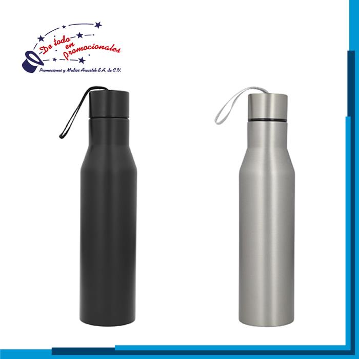 Cilindro de acero inoxidable, con tapa de plástico traslúcida enroscable y correa de silicón. Capacidad 800 ml.