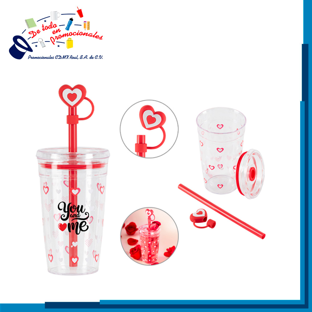 Vaso coleccionable de plástico transparente con motivos de corazón, cuenta con tapa a presión anti derrames, sellos de silicón y popote de color con protector de popote en forma de corazón. Es ideal para bebidas frías. CAP. 450ml. Presentación: Caja kraft.