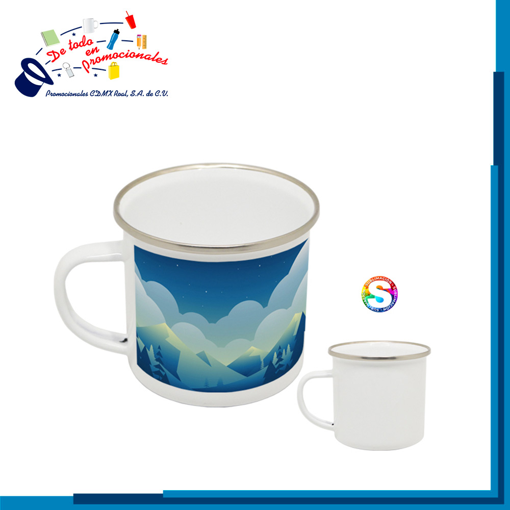 Taza de peltre para sublimación. Borde con terminado plateado. Cap. 350 ml. (12 OZ).