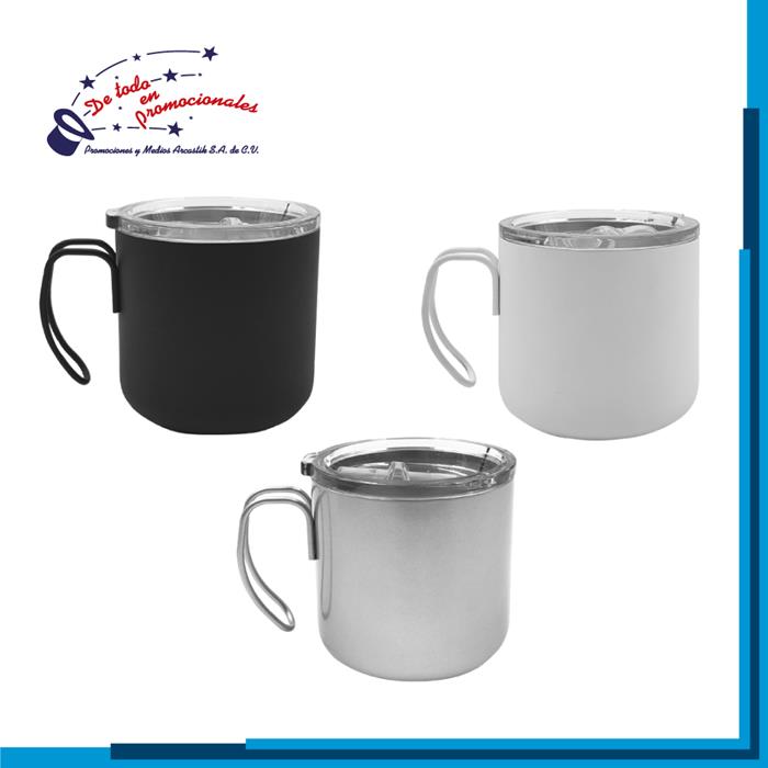Taza de acero inoxidable con acabado mate y asa de plástico. Capacidad 180 ml.