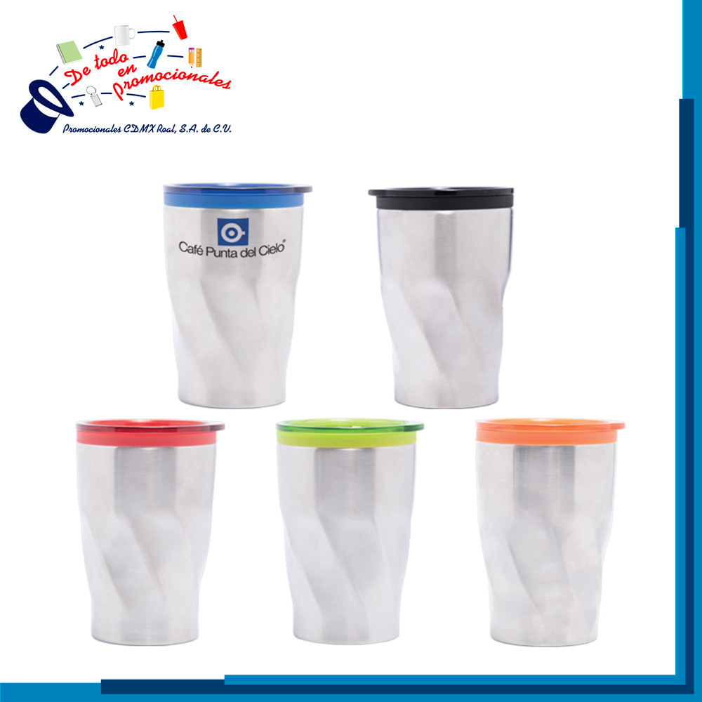 Termo de acero inoxidable con interior de plástico. Cuenta con tapa de cierre a presión y seguro deslizable al color del interior. Diseño poligonal. CAP. 350 ml. Presentación: Caja individual.