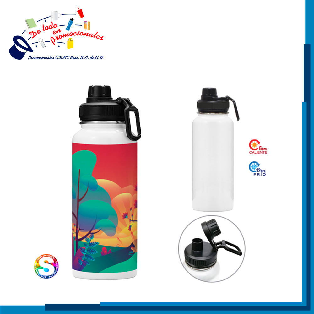 Termo de doble pared para sublimación insulado al alto vacío. Mantiene las bebidas frías por 12 hrs. y calientes por 6 hrs. Tapa de rosca con boquilla y asa para sujetarlo fácilmente. CAP. 1,200 ml. (40 OZ). Presentación: Caja en color negro.