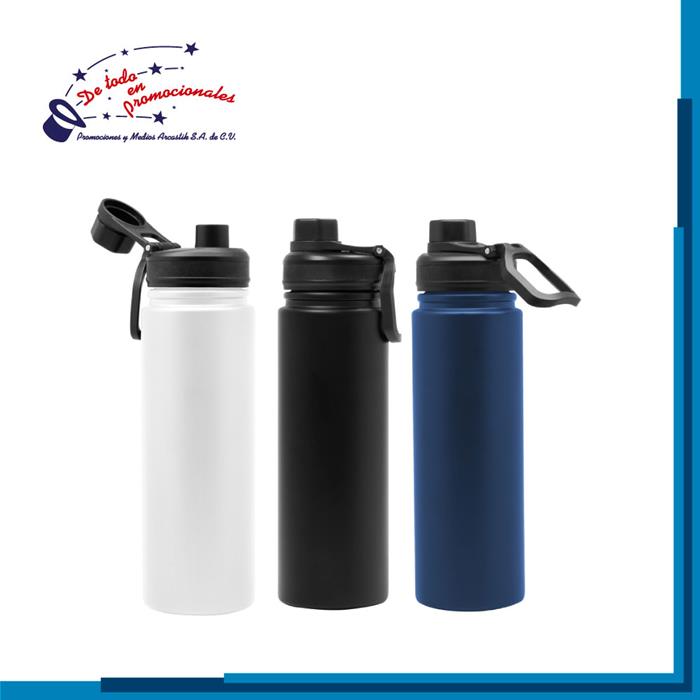 Botella deportiva doble pared con acero inoxidable, sellada al vacío. Tapa con anillo de silicona, boquilla con cierre a rosca antiderrame y manija plástica para su agarre. Mantiene hasta 12 hs la temperatura de las bebidas calientes y 24 hs de las bebidas frías. Capacidad 1000 ml.