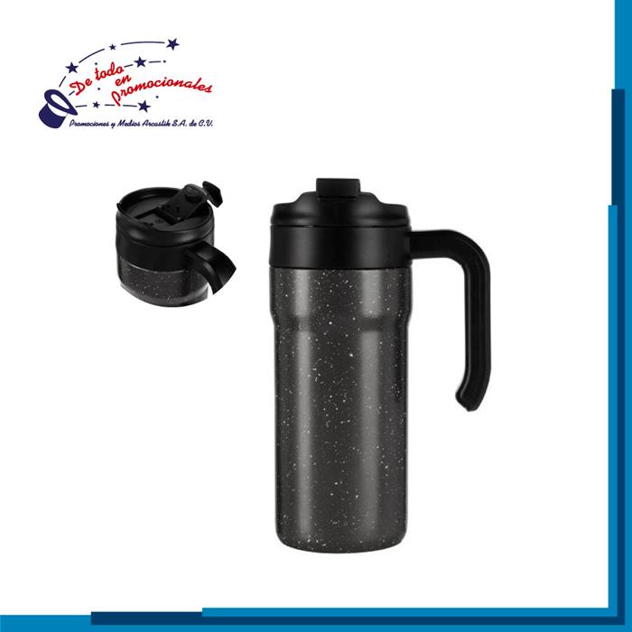 Termo doble pared con cerrado al vacío. Pared interna y externa de acero inoxidable. Incluye tapa de plástico con cierre de rosca y válvula de seguridad. Banda de silicón texturizada antiderrapante. Mantiene temperatura caliente 6 hrs y temperatura fría 8 hrs Capacidad 500 ml.