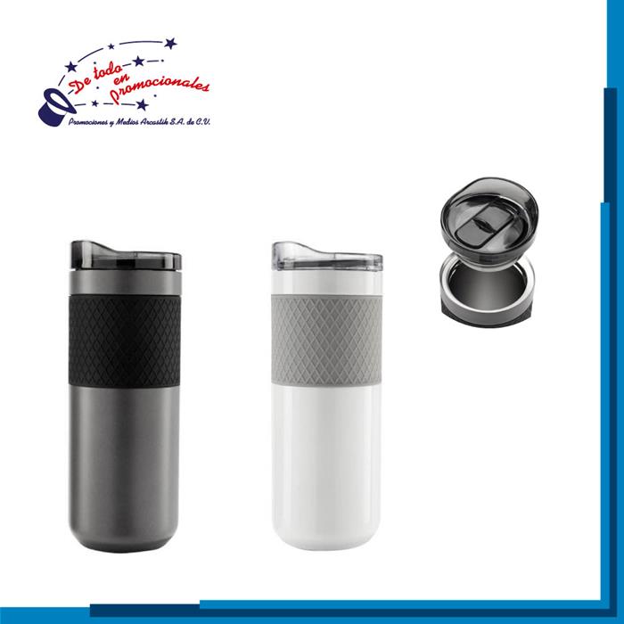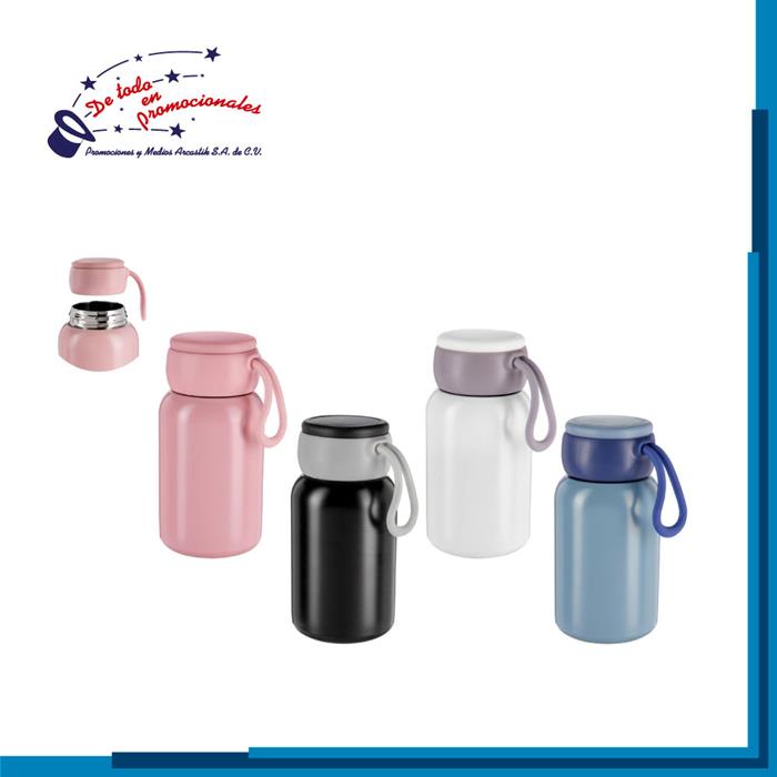 Termo doble pared. Con pared interna de plástico y externa de acero inoxidable. Barras antiderrapantes y tapa de plástico con válvula de seguridad. Capacidad 400 ml.