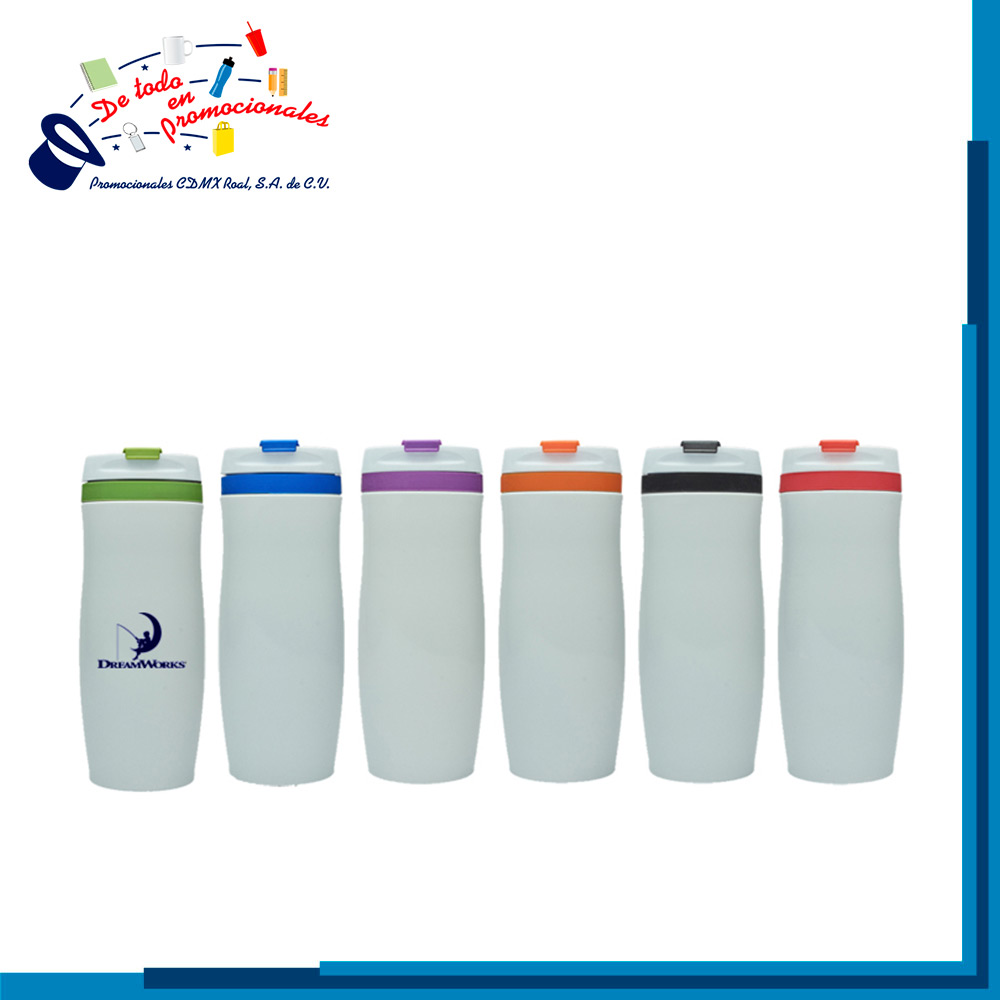 Termo metálico con diseño ergonómico, con acabado en esmalte blanco y banda superior de silicón en color. Cuenta con interior en acero inoxidable, tapa de rosca hermética, seguro para líquidos con bisagra en color y goma anti derrapante en la base. CAP. 400 ml. Presentación: caja en color blanco.