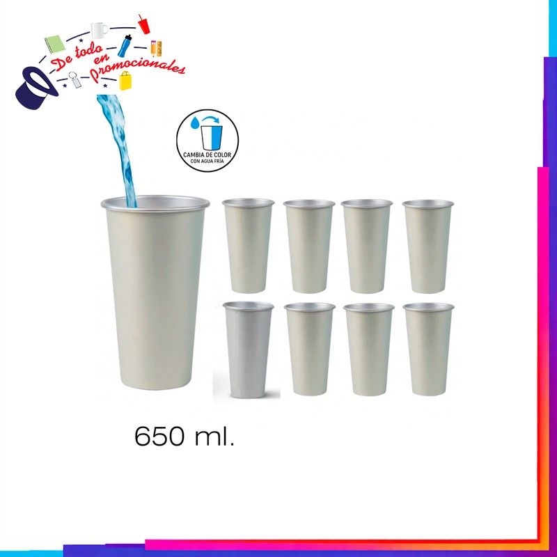 Vaso de aluminio que al contacto con el agua fria cambia de color.
