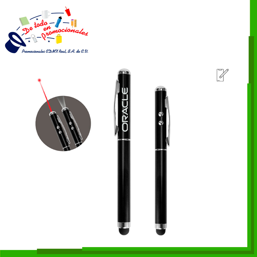 Bolígrafo metálico, clip y detalles plateados; cuenta con luz LED y apuntador láser, botones de encendido para cada una de estas funciones, así como touch para dispositivos con pantallas táctiles. Ideal para esas juntas de negocios. Presentación: caja en color negro.