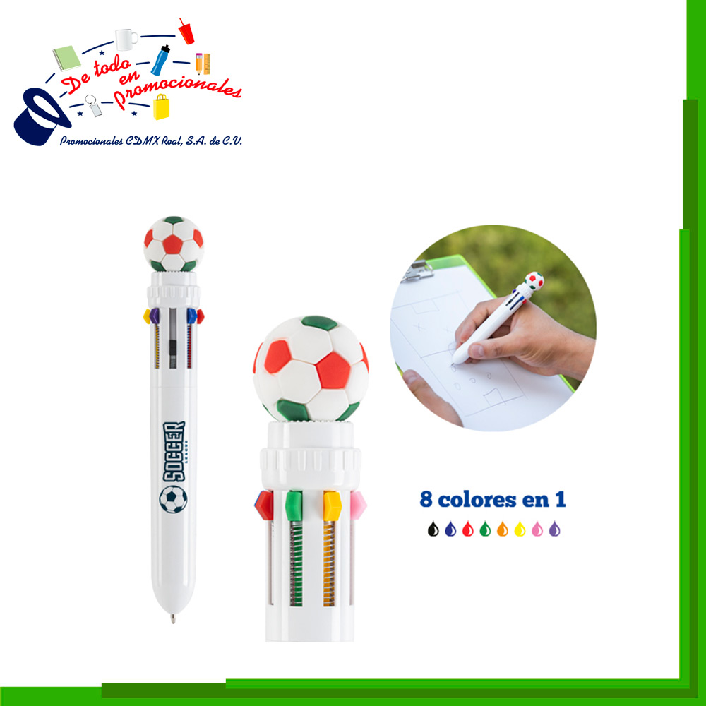 Bolígrafo de plástico multitintas con figura de balón tricolor de soccer en la parte superior, incluye 8 colores de tinta diferentes.