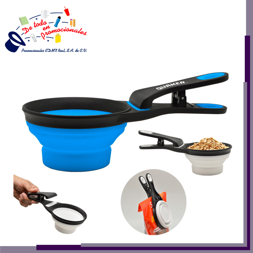 Taza medidora multifunción, plegable la cual permite ahorrar espacio al guardarla o transportarla fácilmente. Cuenta con un clip en el mango que nos permite un cierre fácil de las bolsas. CAP. 1 taza (8.0 Oz)