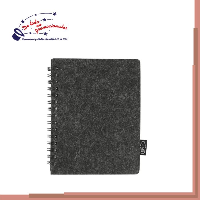 Libreta ecológica fabricada con cubierta y separadores de polipropileno reciclado con wire-o, tamaño A5, resorte sujetador de pastas y peso de 80 gramos. Papel 100 % reciclado con 96 hojas cuadriculadas y de rayas que vienen intercaladas.