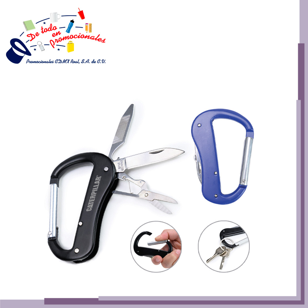 Gancho con clip multifunción que incluye: tijeras, navaja y destapador con lima. Presentación: caja individual de kraft.