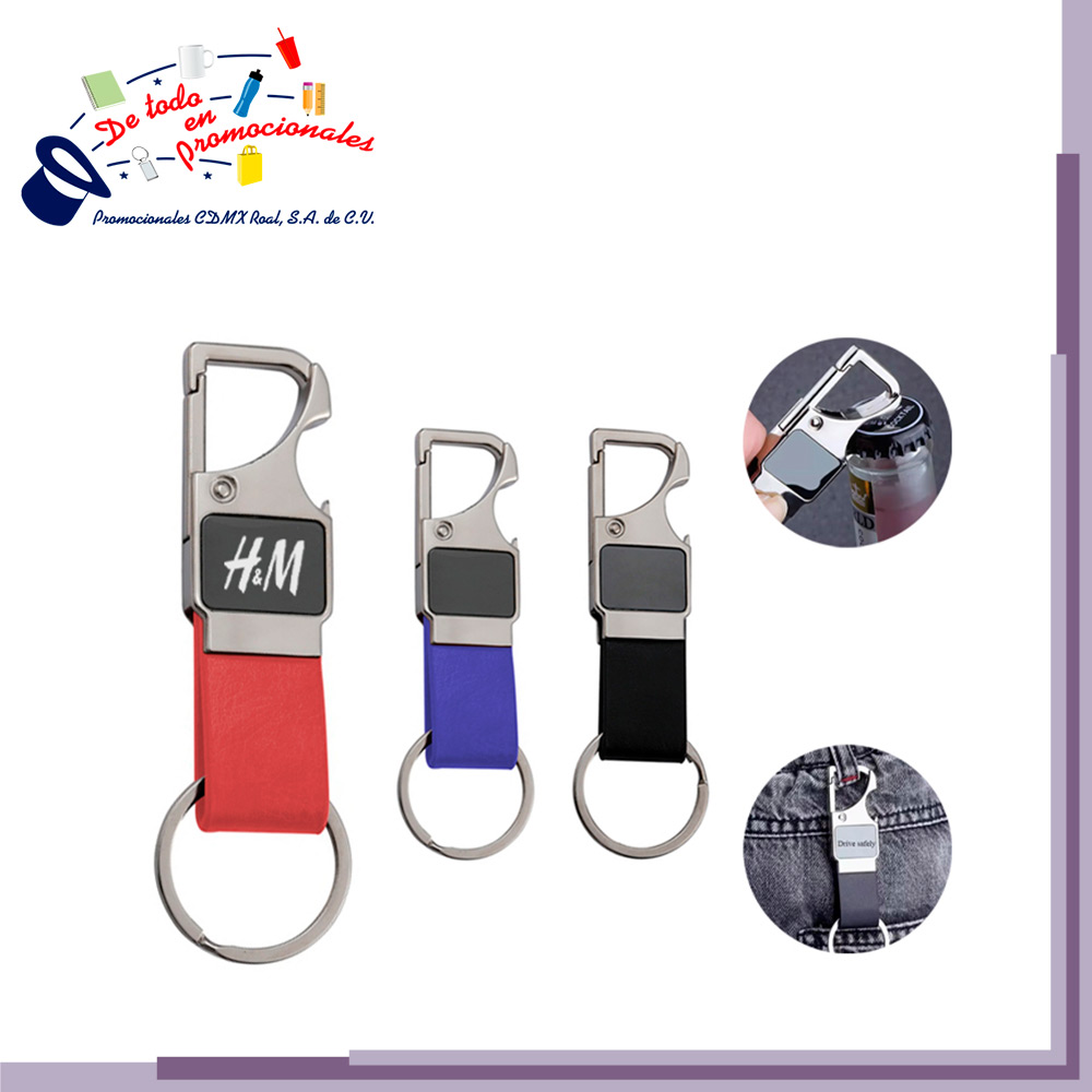 Llavero metálico multifuncional con correa de PU, gancho para colgarse y destapador. Presentación: caja individual.