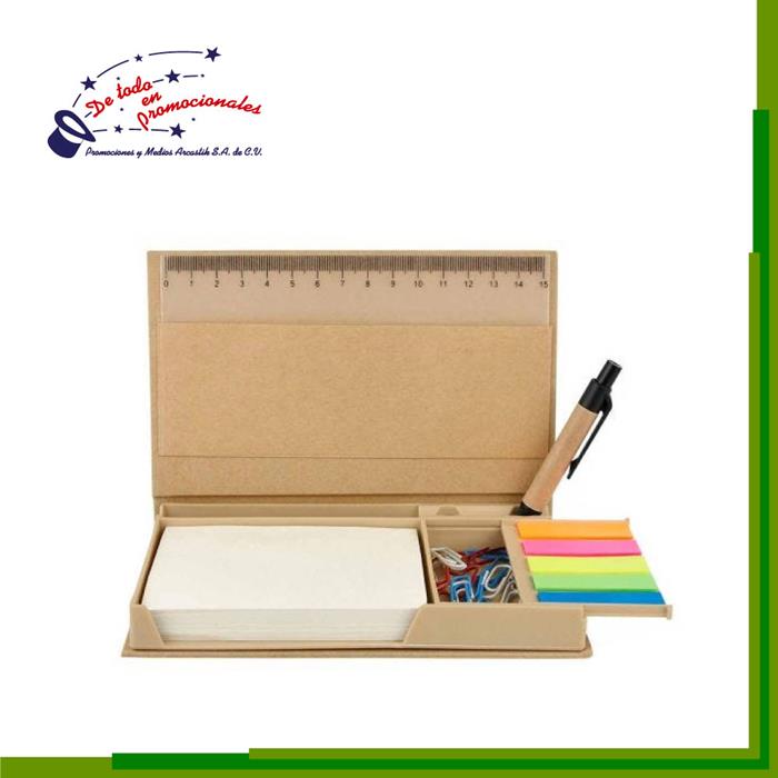 Incluye bolígrafo ecológico, regla de 12 cm, 100 hojas de notas blancas, 25 notas adheribles beige y banderas de 5 colores.