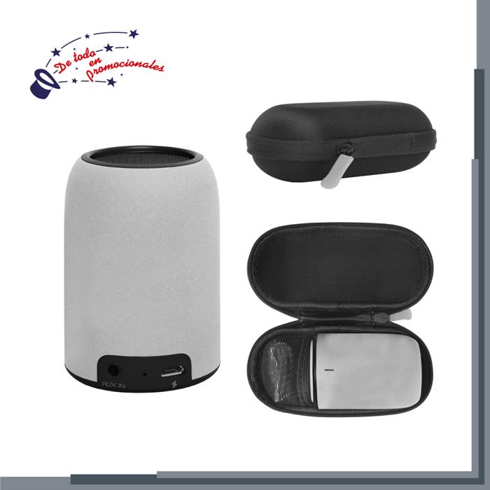 Mini bocina Bluetooth de plástico y acabado rubber en forma de hongo con ventosa para sujetarse al celular o superficies lisas. Duración de 2.5 horas.
