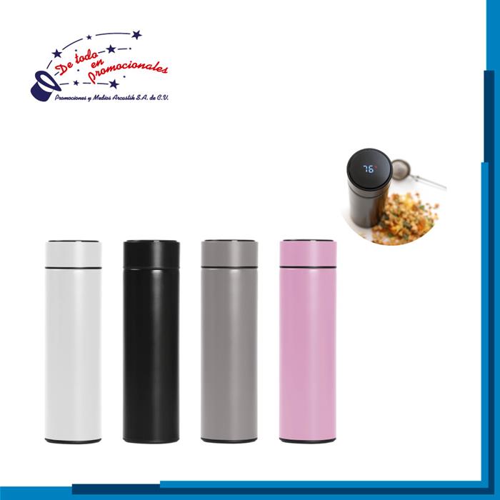 Termo de acero inoxidable con bocina bluetooth y radio FM en la tapa, agarradera de plástico y cable de carga. Capacidad 460 ml.