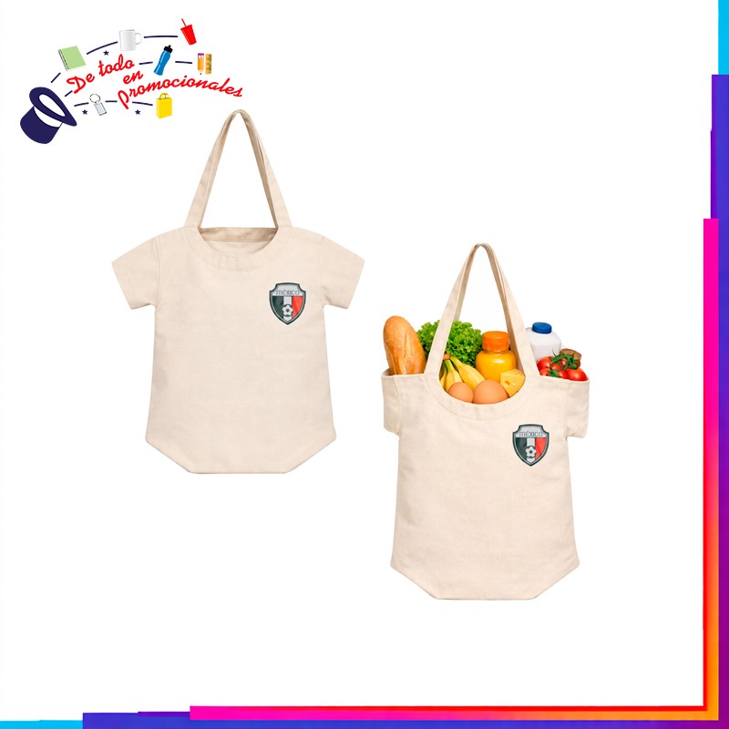 Bolsa de algodón con forma de camiseta, asas y escudo de México.