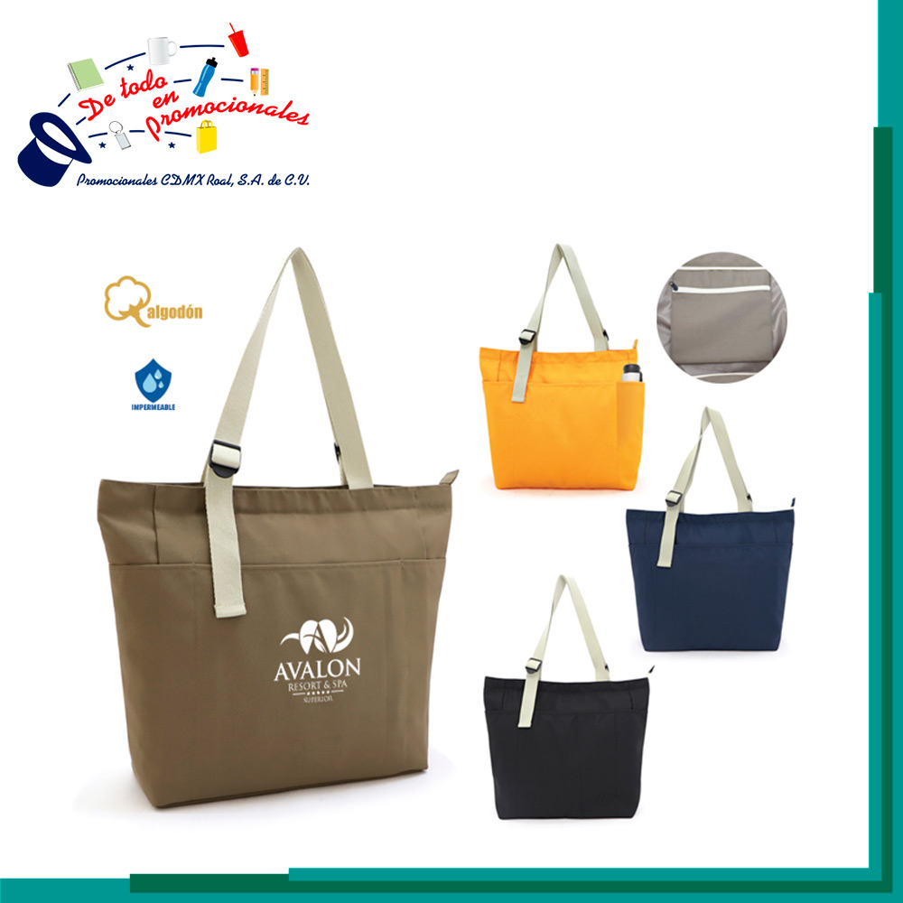 Bolsa de poliéster con cierre central, forro interior y bolsillo interno pequeño con cierre. La parte exterior cuenta con un compartimento frontal y 2 laterales, tiene 2 asas de algodón con broche ajustable, del mismo color de los cierres.
