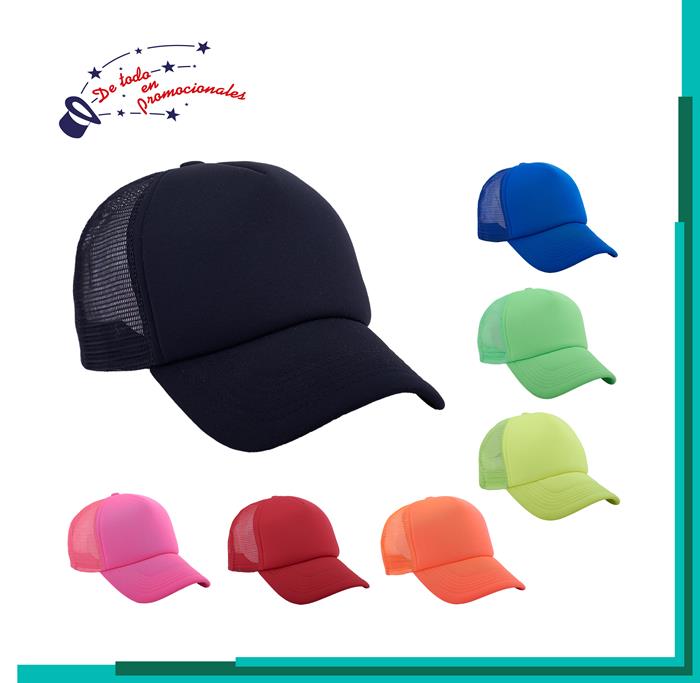 Gorra fosforescentes de poliéster con cuerpo y visera del mismo color, frente acolchado y 4 gajos en malla, ajuste con broche de plástico.