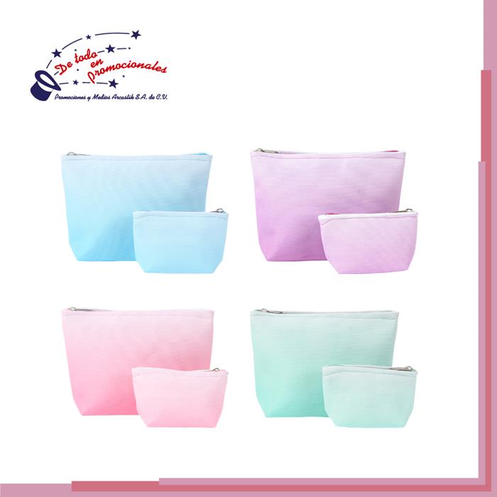 Bolsa cosmetiquera fabricada en poliéster con cierre negro metálico. Diseño compacto y adecuado para llevar a cualquier lugar.