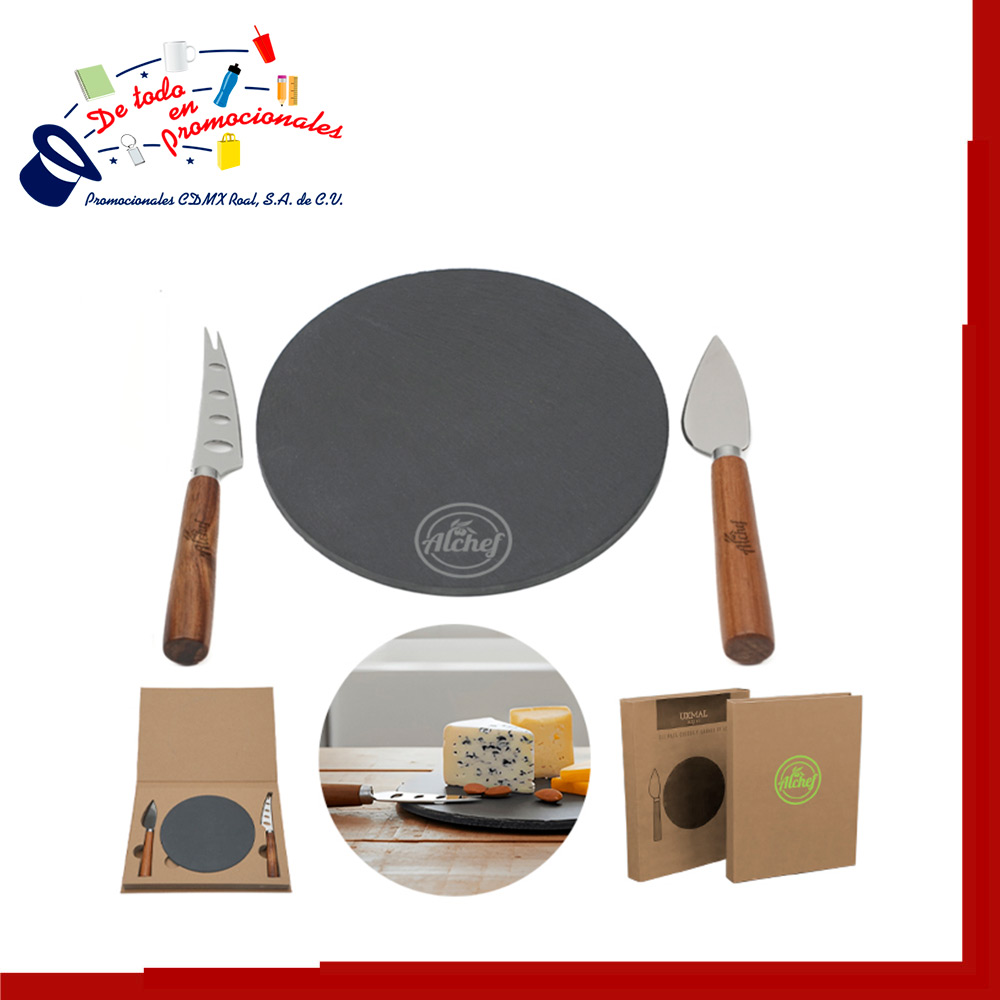 Set para quesos y carnes frías. Incluye 2 cuchillos de acero inoxidable con mango de madera de acacia y una base de piedra. Presentación: caja individual